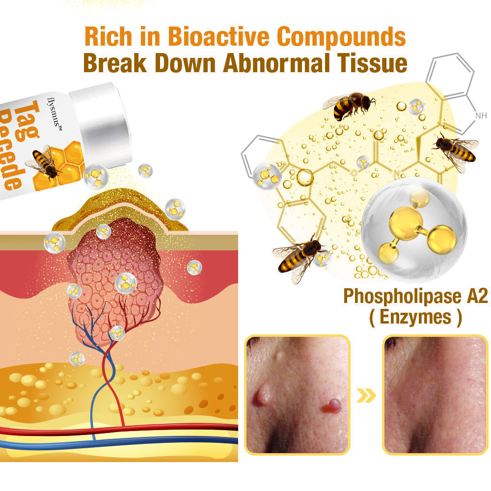 Bee venom contains several bioactive compounds, including melittin, apamin, and adolapin which has been scientifically proven to tackle skin tags or warts effectively. Among its arsenal of enzymes, phospholipase A2 stands out for its ability to break down abnormal tissue, simplifying the removal process of skin tags or warts.