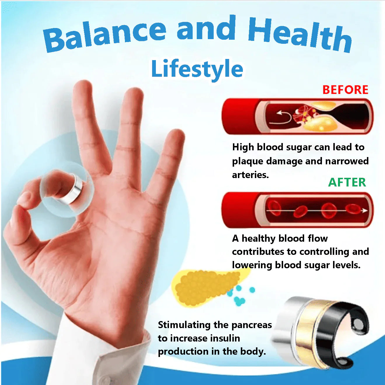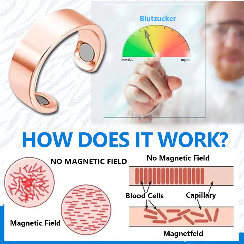 The blood sugar control ring uses magnet therapy. When worn on the finger, it activates specific acupuncture points, improves pancreatic function, and stimulates insulin production. This helps control blood sugar and balance glucose levels, promotes metabolism, and thus strengthens overall health and the immune system.