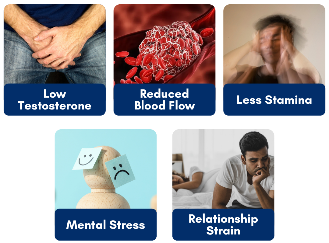 You’re not broken, too young, or alone in this. The truth is, most solutions ignore the root cause—poor blood flow. Combined with falling testosterone, reduced stamina, mental stress, and relationship strain, performance naturally suffers. By restoring healthy circulation and supporting overall vitality, we address the problem at its core—so you can get back to feeling and performing like yourself again.