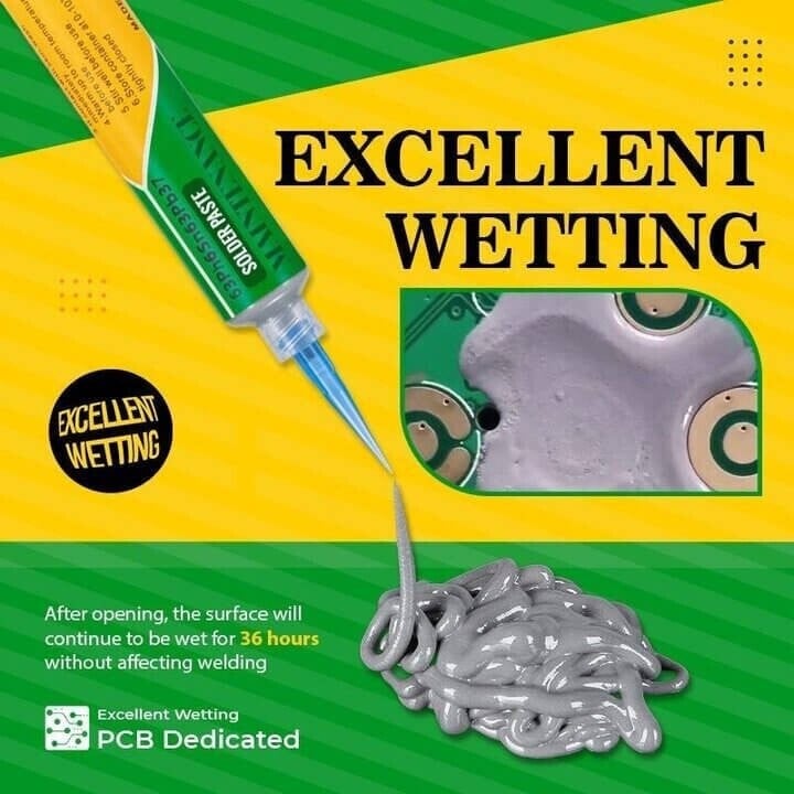 Wetting, anti-dry, relatively long shelf life at room temperature. Unique high quality solder paste, fine and flexible packaging (35g / support), filigree appearance.