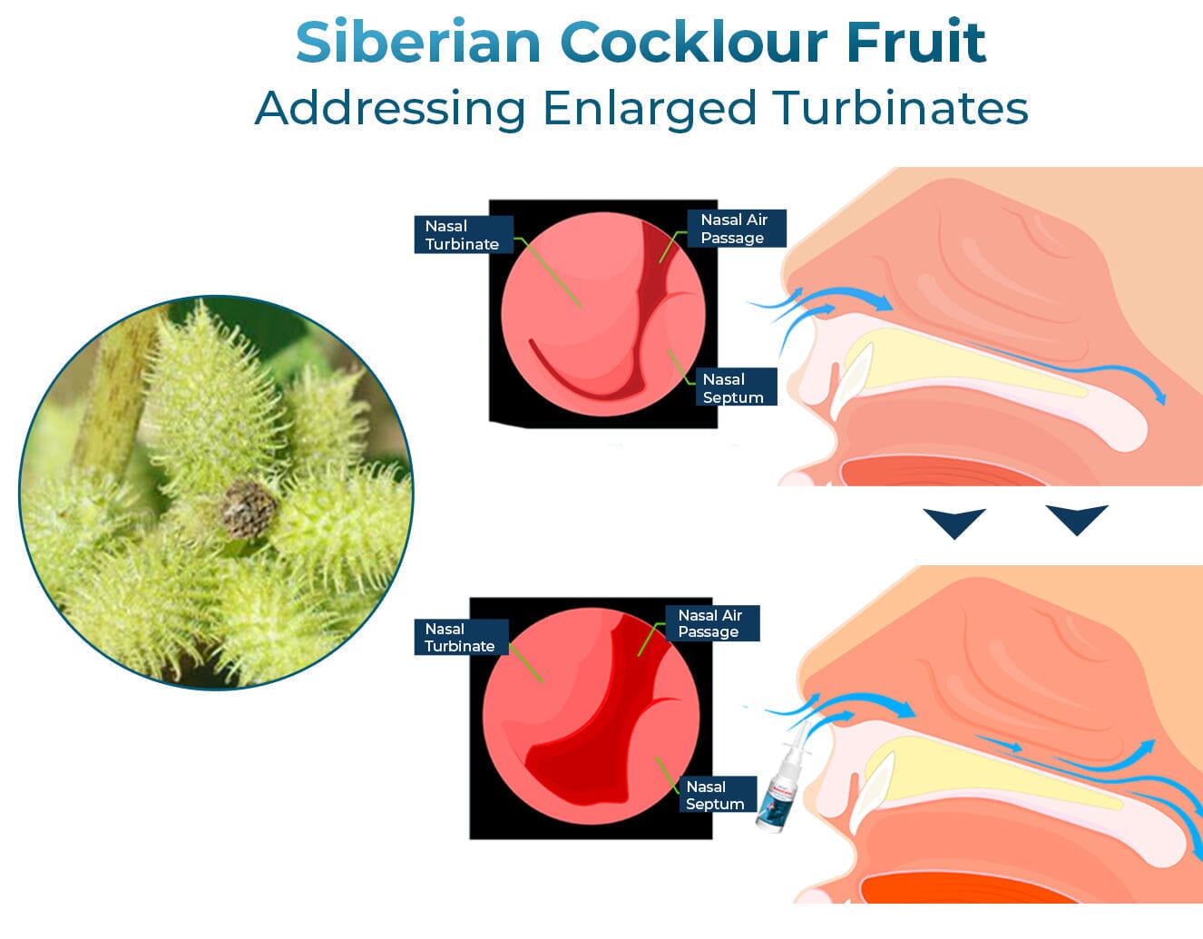 3. Siberian Cocklour Fruit - Addressing Enlarged Turbinates. Enlarged turbinates can be a primary cause of nasal congestion and discomfort. The spray may contain ingredients that specifically target enlarged turbinates, reducing their size and allowing for improved airflow through the nasal passages.