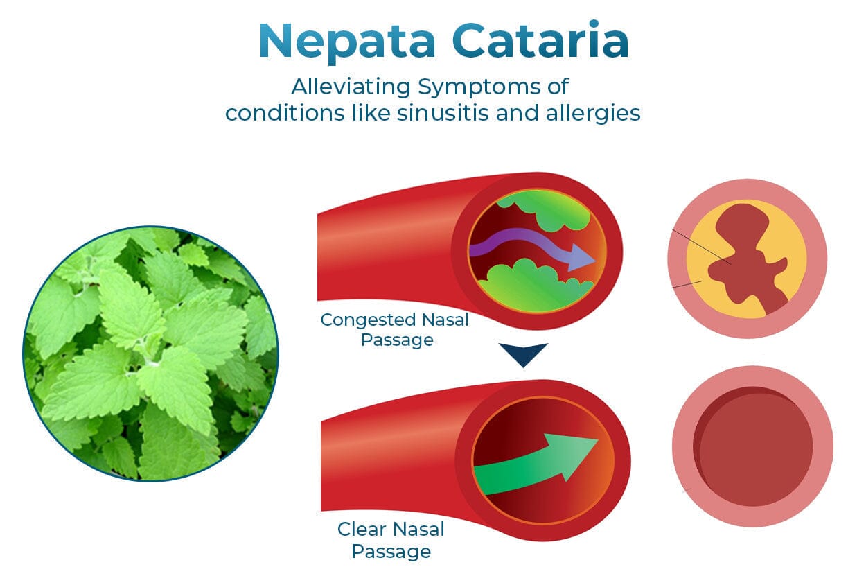 1. Nepata Cataria - Alleviating Nasal Congestion, Smell Changes, and Allergy/Cold/Sinus Symptoms. The spray is formulated to address a range of nasal issues, including nasal congestion, changes in smell perception, and symptoms associated with allergies, colds, and sinus infections.