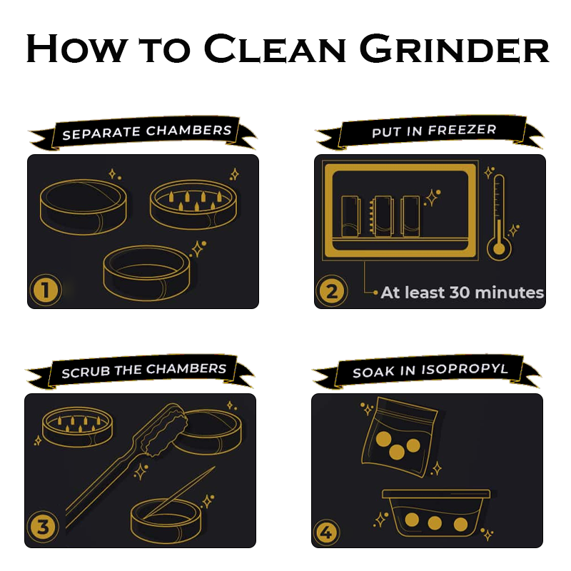 Placing the herb grinder in the freezer will cause the botanical pollen to separate from the grinder's material, enabling easy removal through brushing.