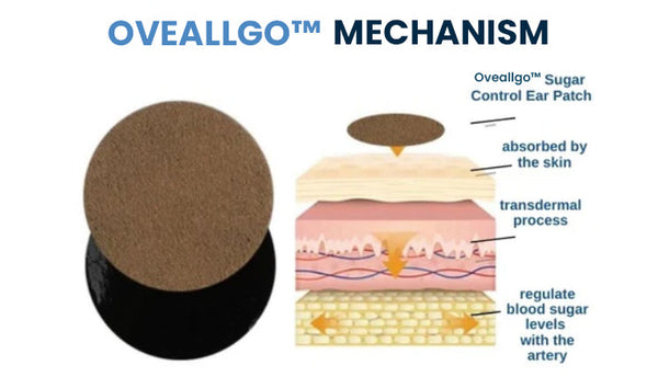 The Oveallgo™ Sugar Control Ear Patch works by delivering medications through the skin and into the bloodstream. The patch is applied to the ear, where it is held in place by an adhesive.